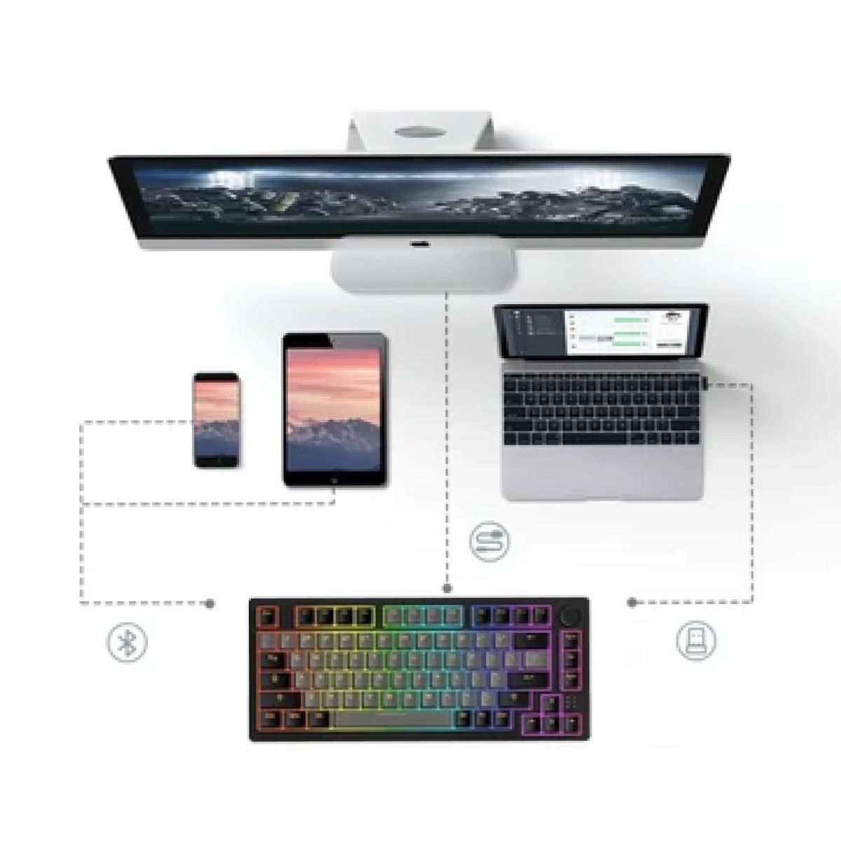 Bàn phím cơ Dareu EK75 Pro Black Golden RGB có kích thước cực gọn khi sử dụng bố cục 75% nhưng vẫn đáp ứng được đầy đủ các phím cần thiết để thuận tiện cho người dùng sử dụng. Bàn phím có thể kết nối với mọi thiết bị thông qua 3 cách: bluetooth, wireless và cổng USB-C. Việc đa dạng phương thức kết nối không chỉ giúp quá trình kết nối đơn giản hơn mà còn làm tăng khả năng tương thích của bàn phím.