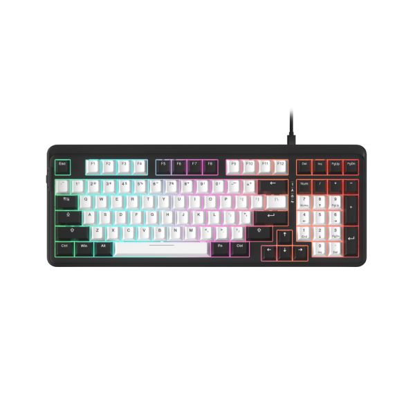 Bàn phím cơ DareU EK98 White-Black gây ấn tượng với thiết kế 98 phím gọn gàng, kết hợp giữa hai tông màu trắng và đen thời thượng. Hệ thống đèn LED nhiều màu càng làm tăng sự nổi bật cho không gian làm việc hoặc chơi game.