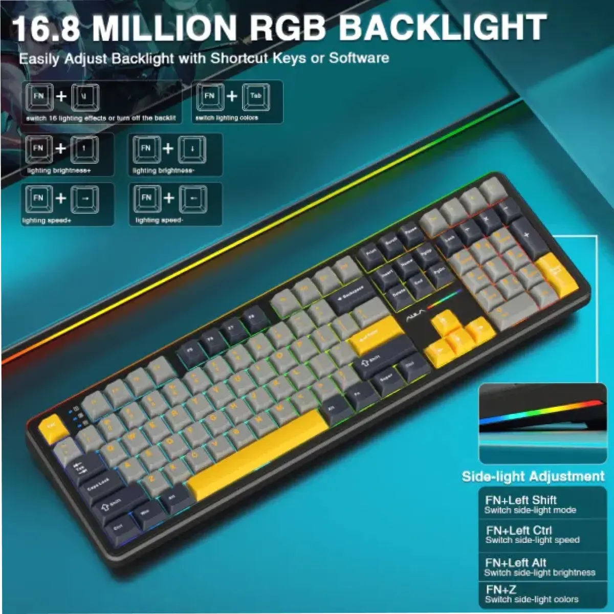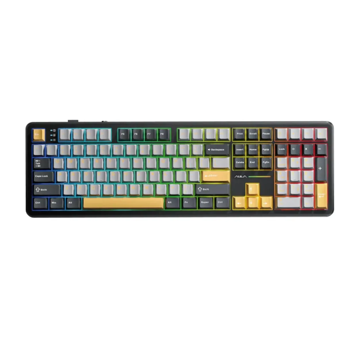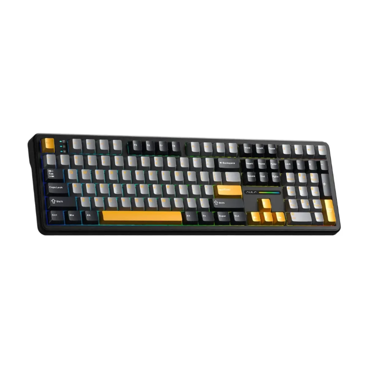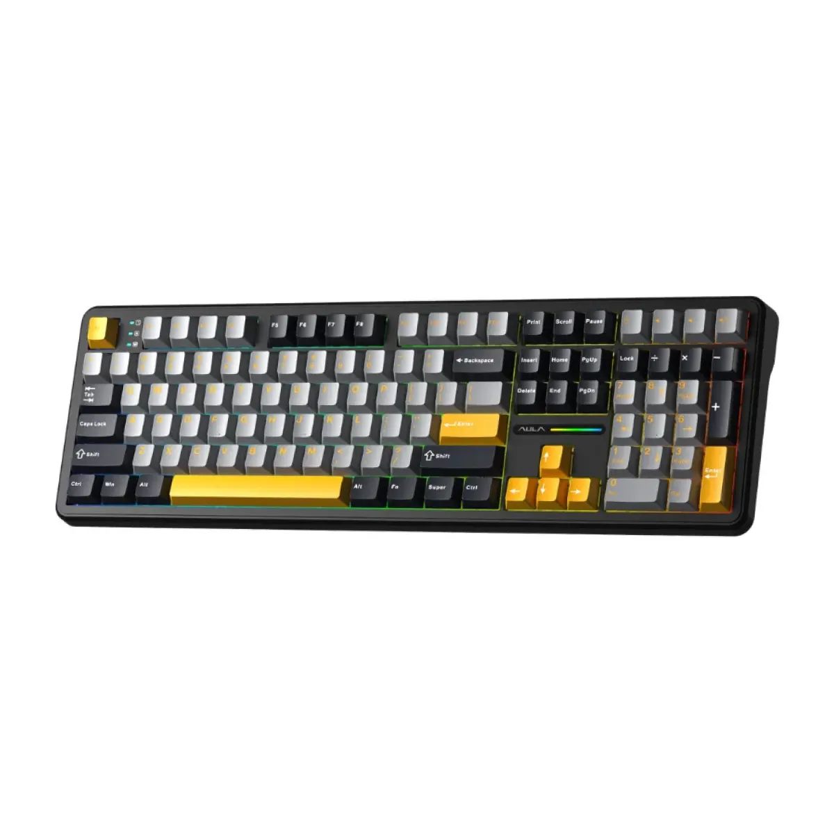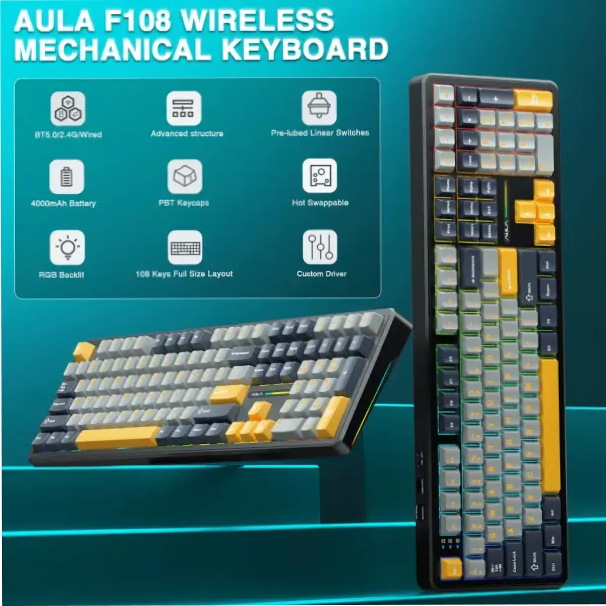 Bàn phím cơ không dây Aula F108 đen xám vàng – Thiết kế hiện đại, bắt mắt
