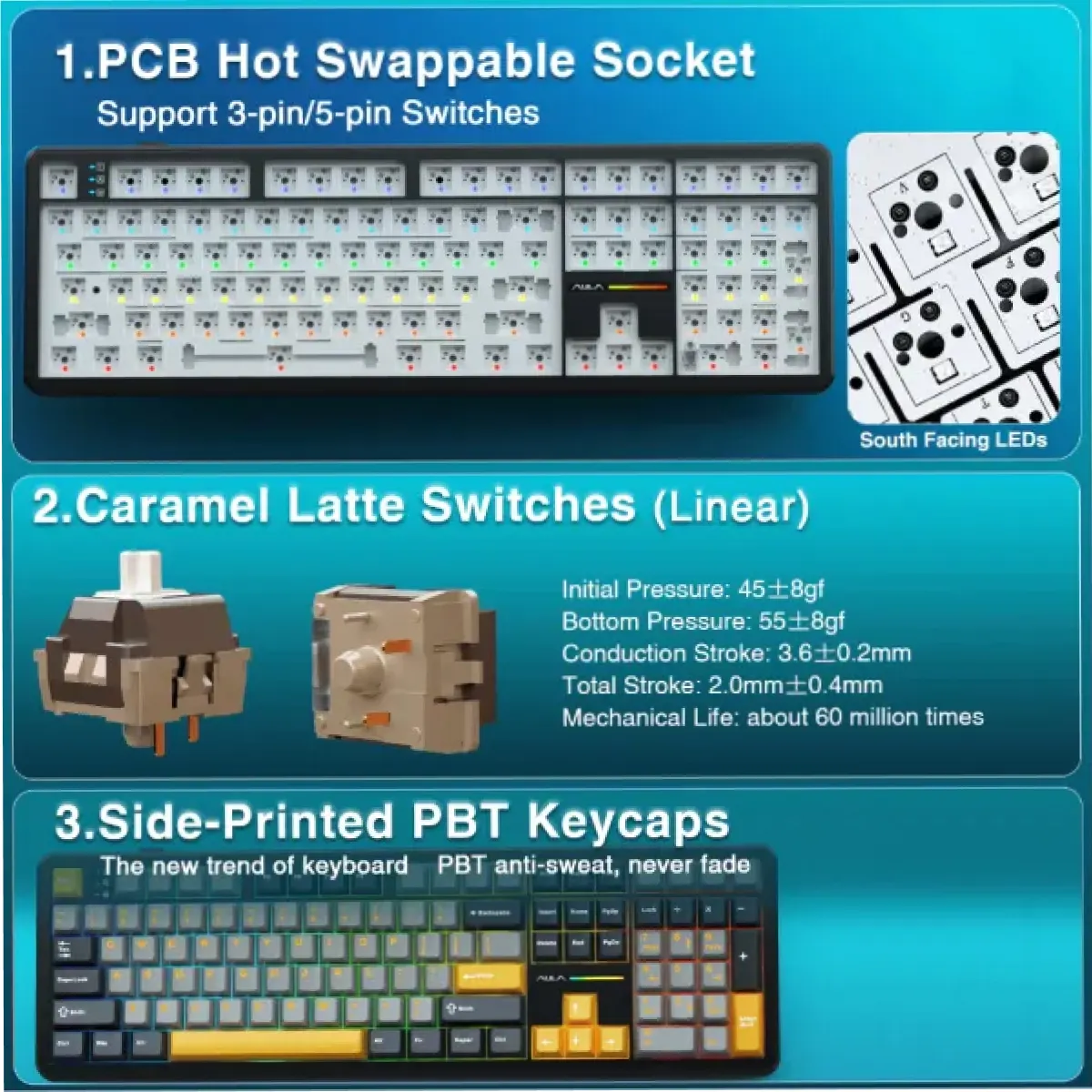 Keycap, switch hiện đại của bàn phím cơ không dây Aula F108 đen xám vàng