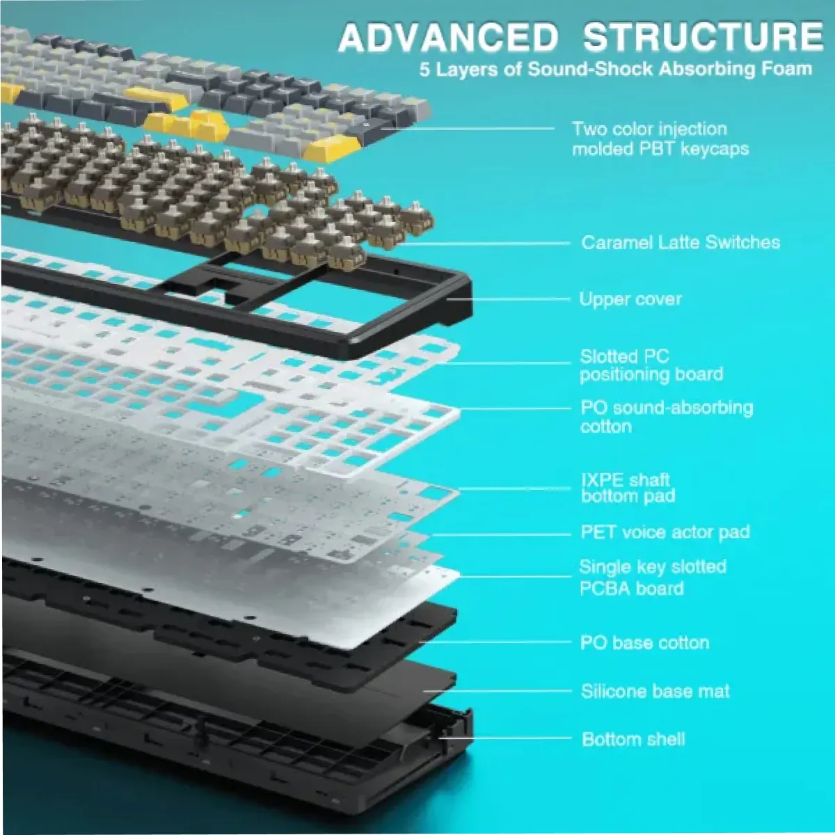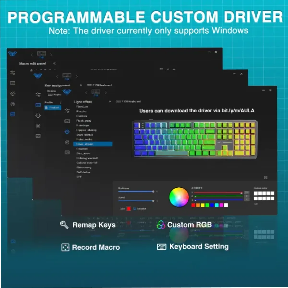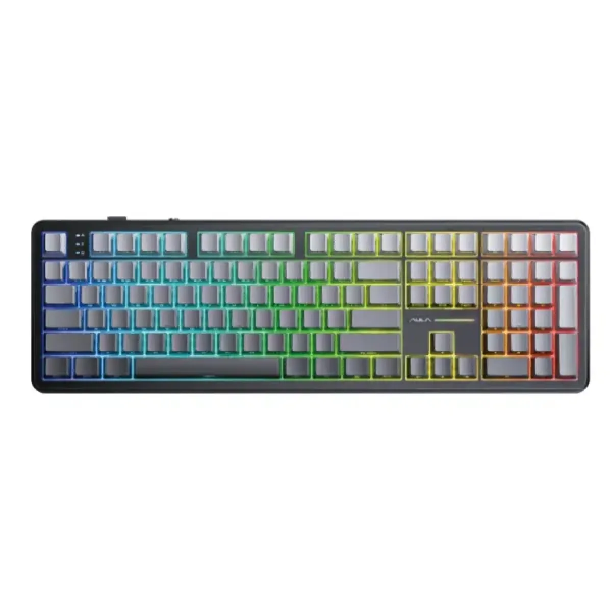 Aula F108 sở hữu phối màu xám đen Gradient tạo hiệu ứng thị giác bắt mắt, phù hợp với nhiều không gian setup. Khung bàn phím được chế tác bền chắc, bố cục fullsize 108 phím đầy đủ phím số, chức năng và điều hướng, hỗ trợ tối ưu cho cả công việc lẫn giải trí.