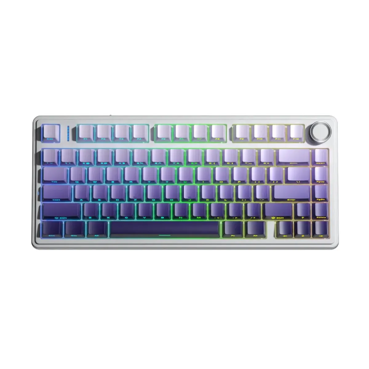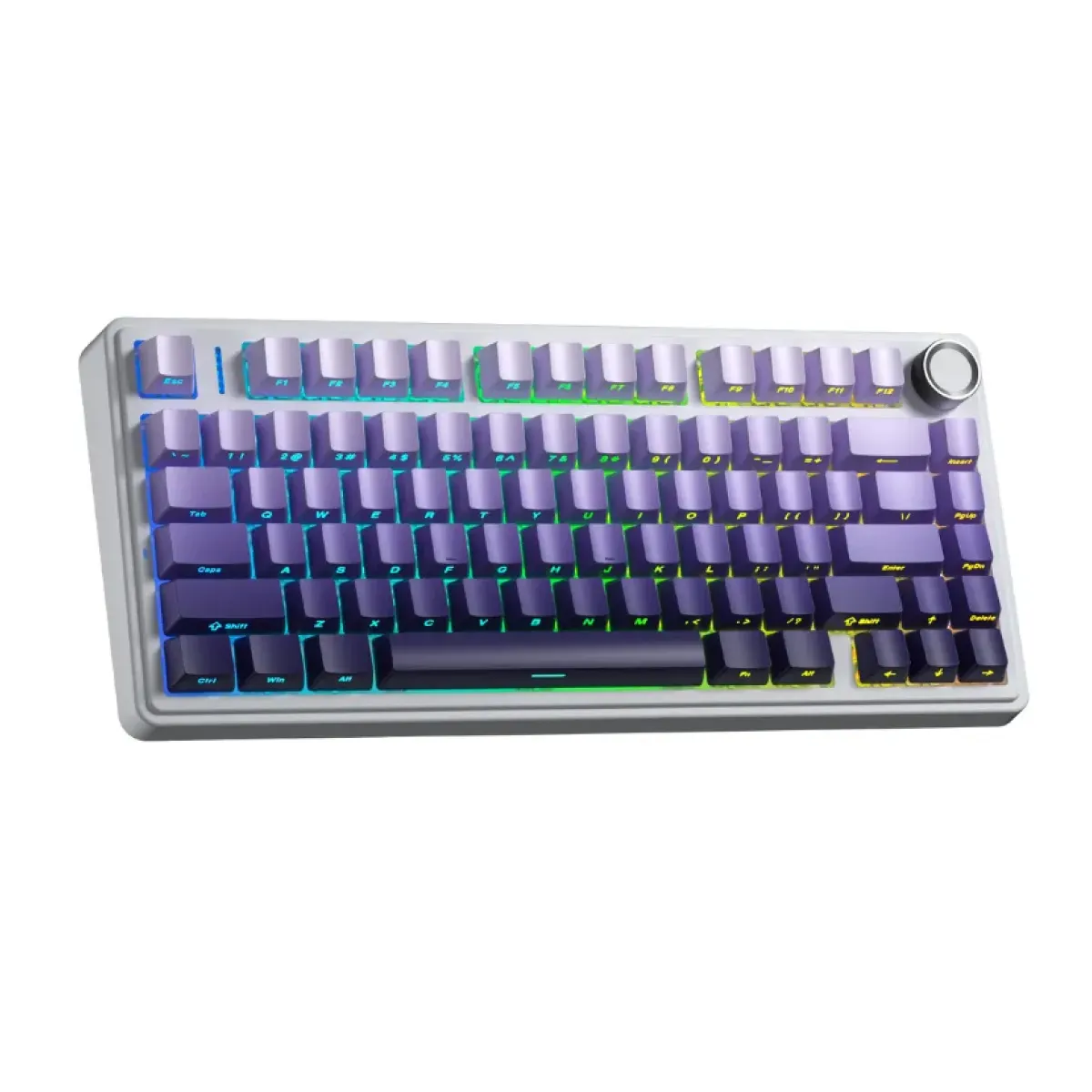 Bàn phím cơ không dây Aula F75 Pro Tím sở hữu thiết kế với layout hiện đại, gọn gàng. Phiên bản tím gradient tạo nên một vẻ ngoài trẻ trung, cá tính và thu hút mọi ánh nhìn. Bàn phím còn được trang bị hệ thống đèn nền RGB 16.8 triệu màu, cho phép người dùng tùy chỉnh hiệu ứng ánh sáng đa dạng, từ những dải màu đơn cho tới hiệu ứng chuyển động màu sống động chiếu sáng đều các phím.