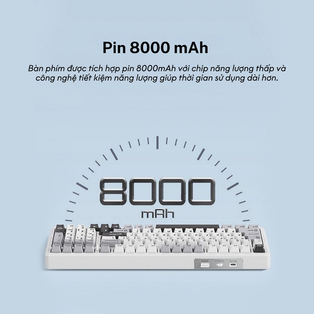 Giảm 500K khi thanh toán bằng thẻ tín dụng HDBankBàn phím cơ không dây Aula F99 Grey Wood V3 Switch đặc trưng bởi độ bền phím lên đến 60 triệu lần bấm cùng tạo hình hiện đại, bắt mắt với hệ thống LED RGB. Đồng thời, thế hệ bàn phím cơ này còn nổi bật với dung lượng pin 8000mAh. Cùng với đó là khả năng kết nối linh hoạt, đa dạng với 3 chuẩn ghép nối bao gồm có dây Type-C, không dây 2.4G và Bluetooth.