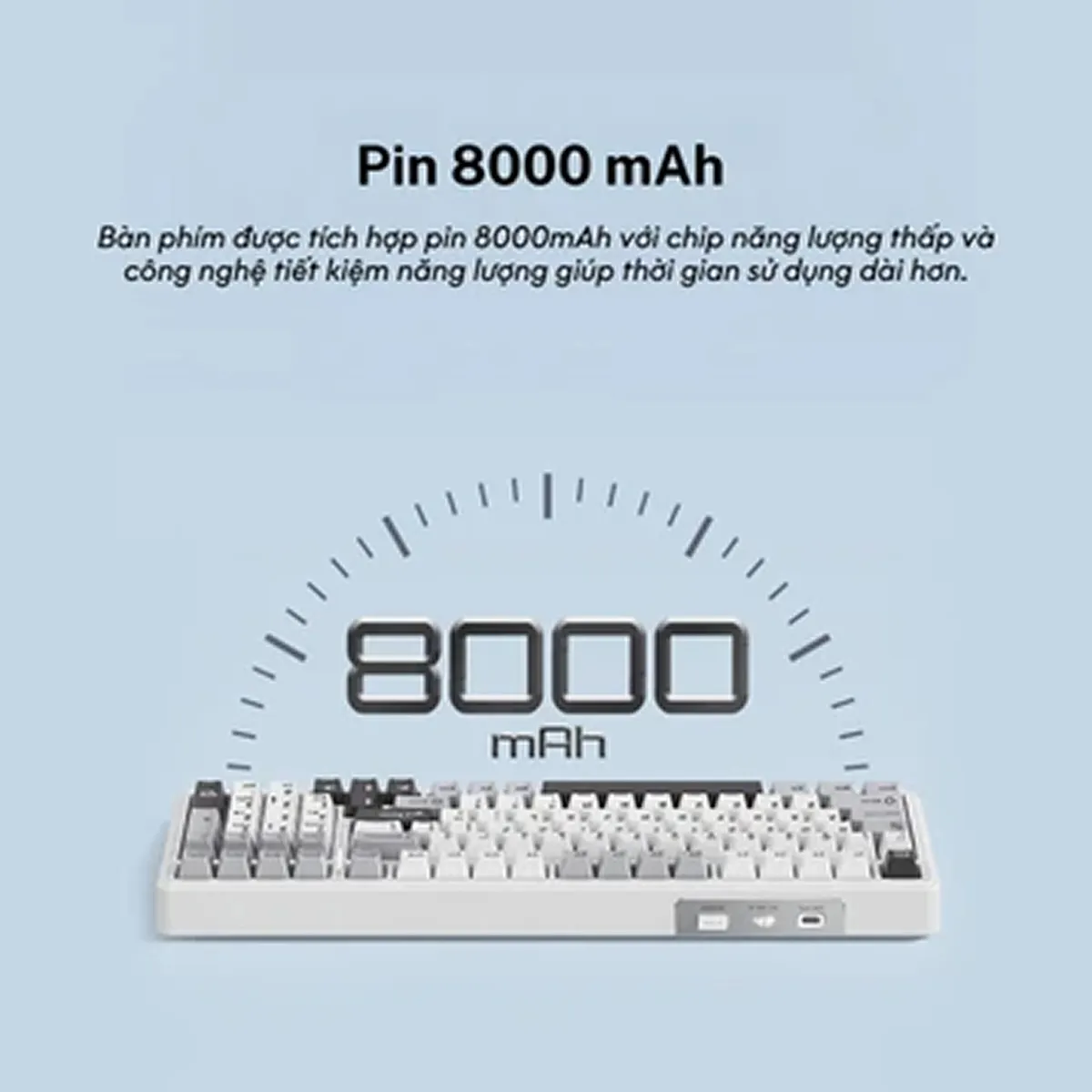 Bên cạnh đó, bàn phím cơ không dây AULA F99 Wood Switch được trang bị pin lithium dung lượng cao 8000mAh, cho thời lượng sử dụng lên đến 53 giờ với một lần sạc đầy. Bàn phím có đèn LED báo hiệu mức pin, giúp bạn dễ dàng theo dõi tình trạng pin.