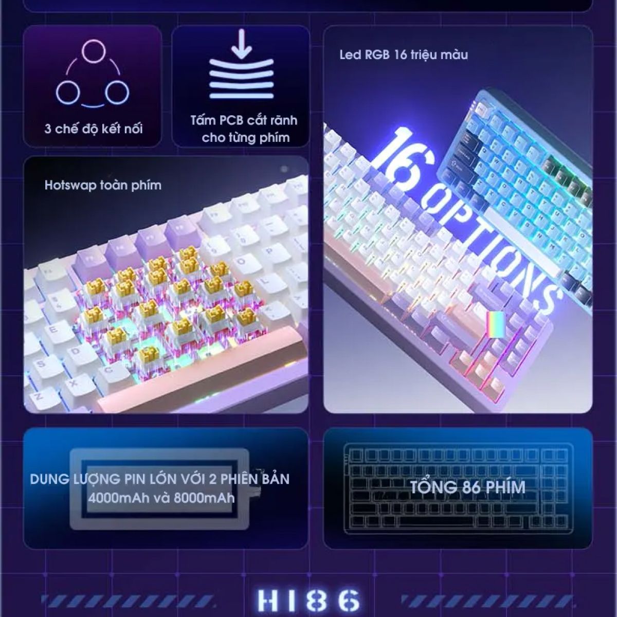Bàn phím cơ không dây Aula HI86 Trắng Đen