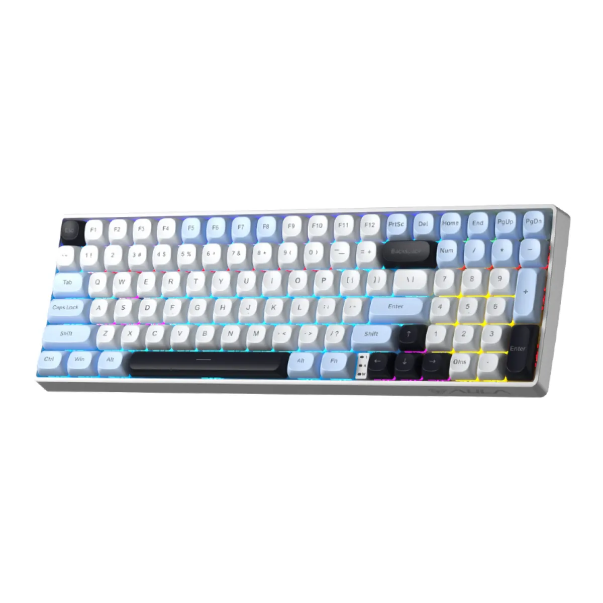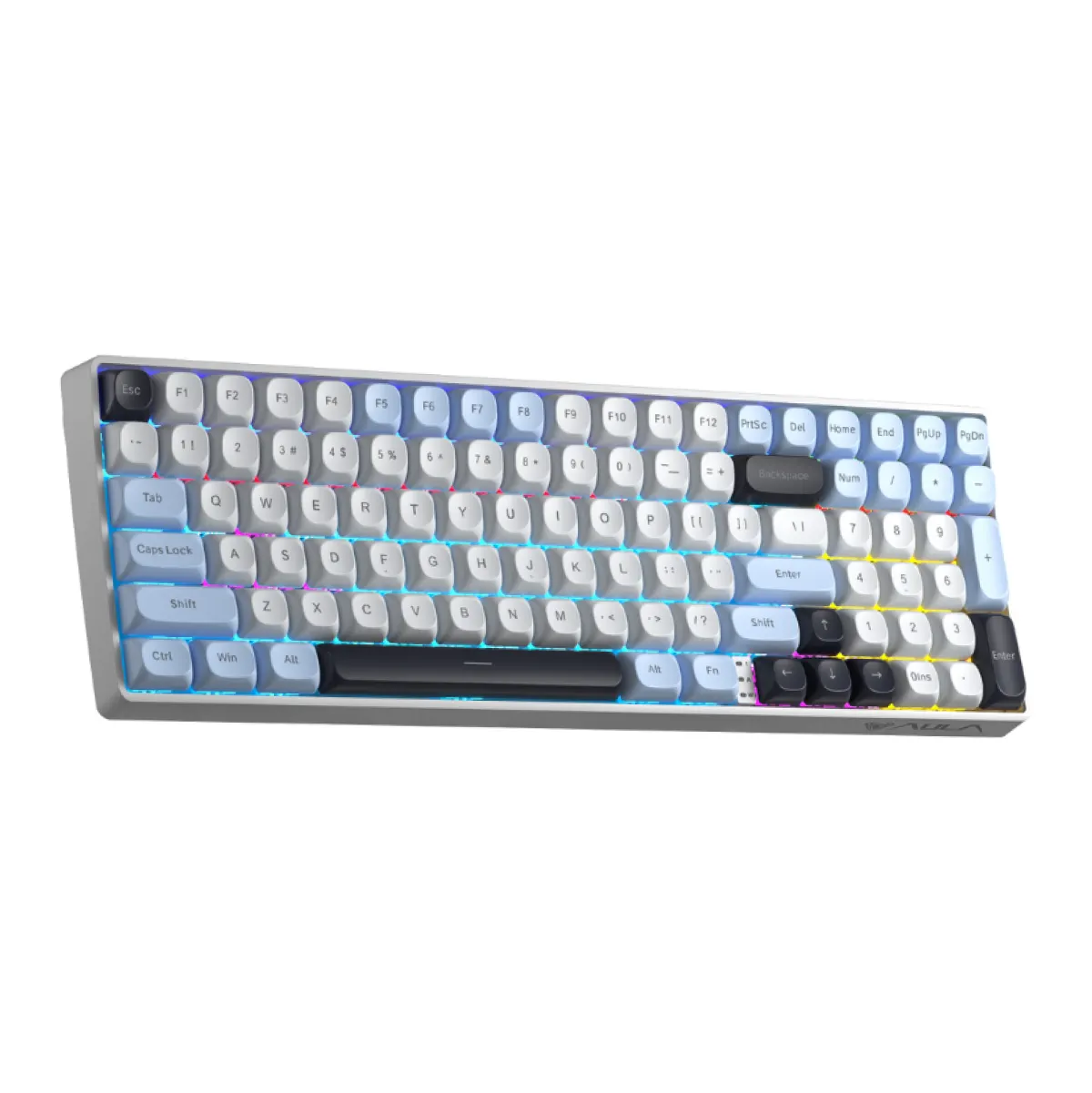 Bàn phím cơ không dây Aula S100 Pro xanh dương trắng tím đậm sở hữu phối màu trẻ trung, tạo điểm nhấn cá tính cho góc làm việc hoặc bàn chơi game. Layout gọn gàng trên bàn phím Aula này giúp tiết kiệm không gian nhưng vẫn đảm bảo đầy đủ các phím chức năng, mang lại sự tiện lợi khi thao tác.