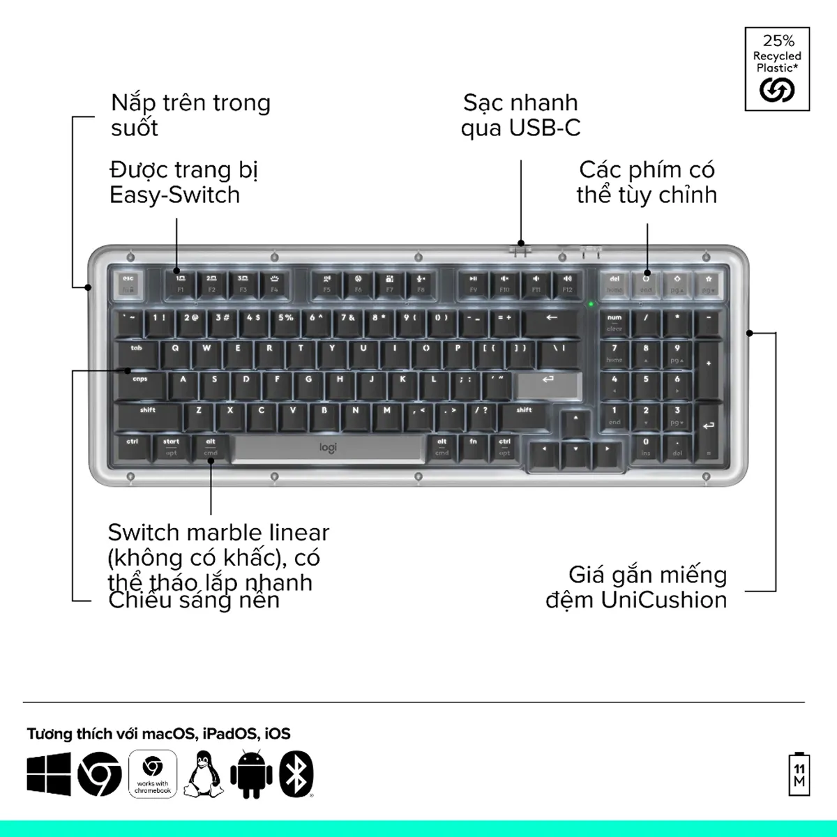 Giảm 500K khi thanh toán bằng thẻ tín dụng HDBankBàn phím cơ không dây Logitech Alto Keys K98M xám đen được thiết kế Full-size 98 phím kèm theo 3 phím tùy chỉnh thao tác, cùng Easy-switch tiên tiến. Bên cạnh đó, chiếc bàn phím Logitech này còn hỗ trợ Bluetooth, kết nối có dây và đầu thu Logi USB. Ngoài ra, đèn nền trắng tích hợp cũng giúp người dùng gõ phím rõ ràng.