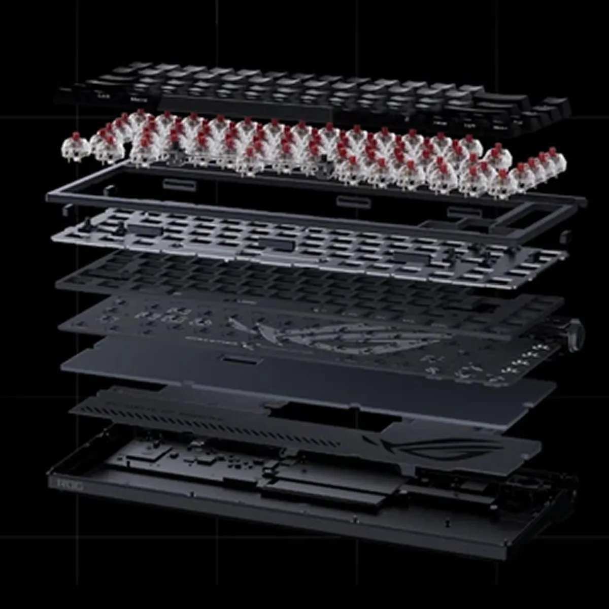 Asus ROG Azoth đen là mẫu bàn phím gaming mang thiết kế Gasket-Mount gồm 3 lớp đệm giảm chấn để mang đến cảm giác gõ êm ái. Cấu tạo bàn phím gồm lớp foam silicone chống rung, lớp foam PORON, lớp silicone và đệm silicone cho trải nghiệm gõ phím cực đã đồng thời giảm thiểu tiếng ồn.