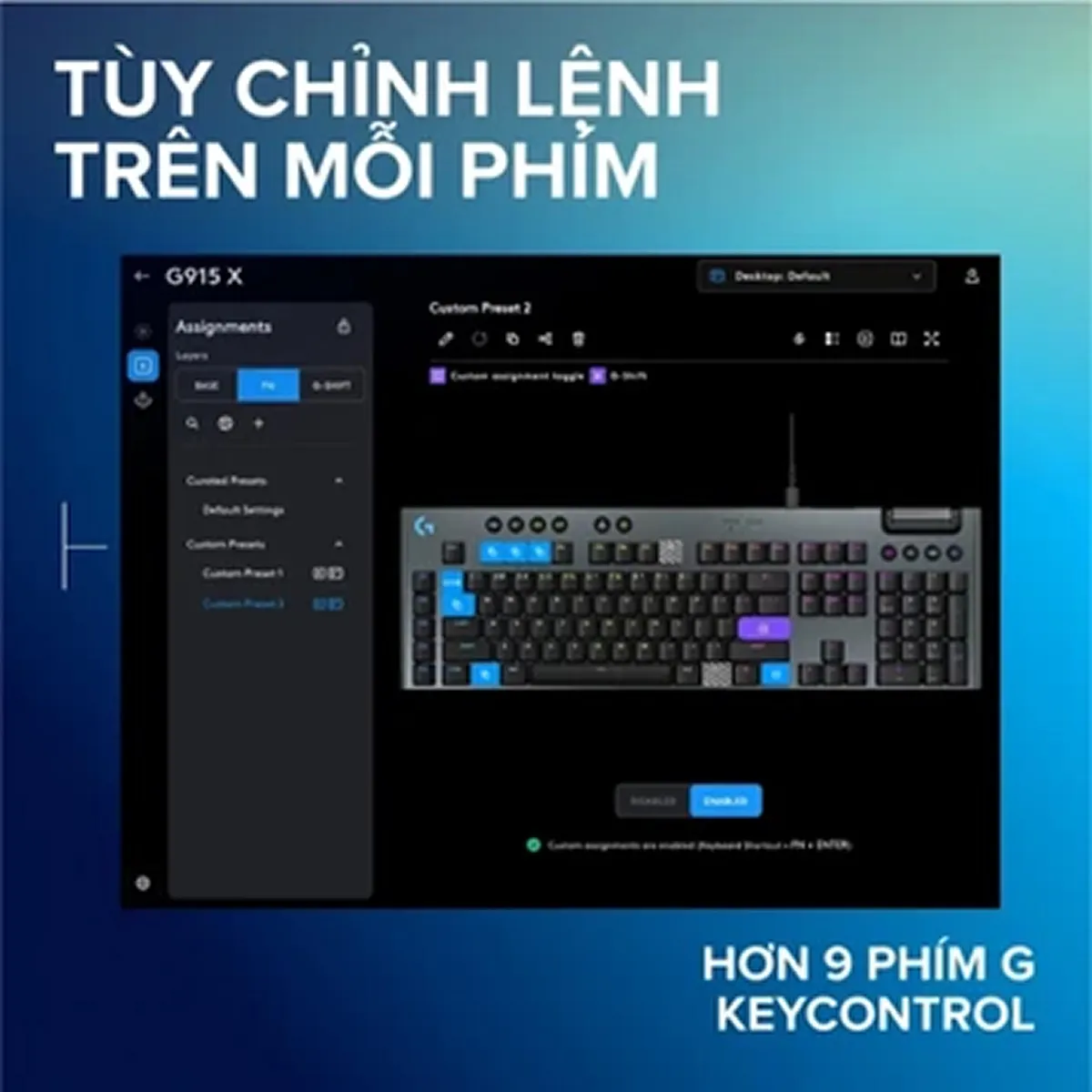 Mẫu keyboard này sở hữu các phím switch cơ học GL dáng thấp với điểm hành trình 1.3mm giúp nâng cấp APM. Giờ đây, bạn có thể tận dụng tối đa mọi khoảnh khắc trong trò chơi với Logitech G915 X Low Profile để tạo ra tốc độ gõ cực cao. Nhà sản xuất tích hợp thêm KEYCONTROL cho phép người dùng thiết lập tối đa 15 chức năng cho mỗi phím để tùy chỉnh cá nhân hoá tốt hơn.