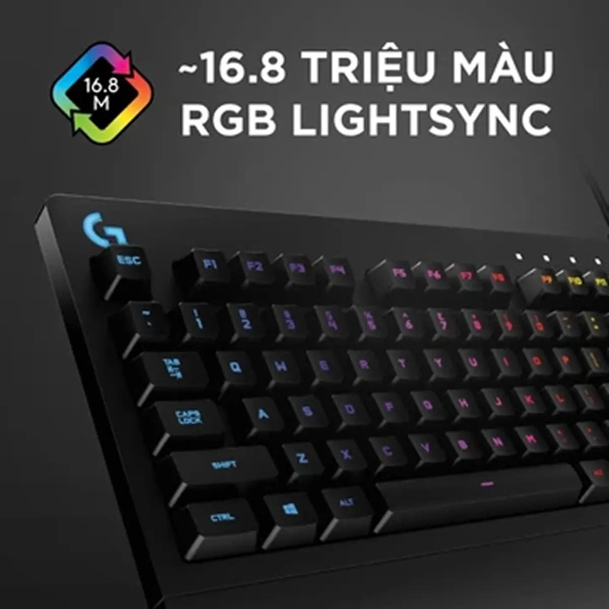 Bàn phím gaming giả cơ Logitech G213 Prodigy tích hợp hệ thống đèn LED RGB ẩn dưới, với hơn 16.8 triệu màu khác nhau tạo nên vẻ ngoài ấn tượng và nổi bật trên từng phím nhấn. Đặc biệt, bạn còn có thể tùy chỉnh thiết lập màu và đồng bộ ánh sáng mô phỏng theo trò chơi với công nghệ LIGHTSYNC, giúp bạn luôn cảm nhận được những đoạn cao trào trong game.