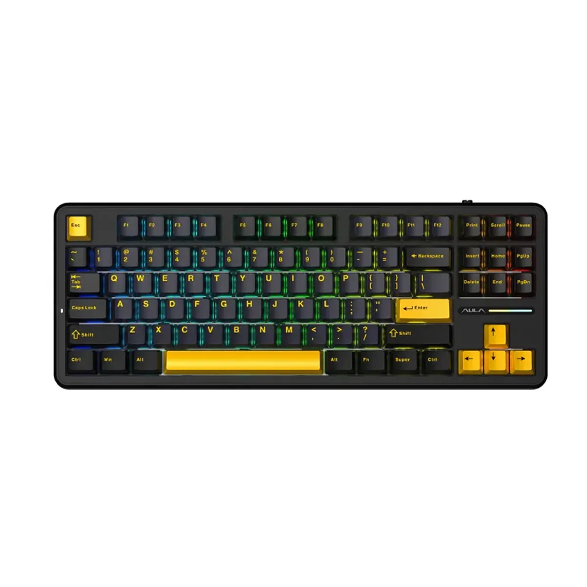 Bàn phím được trang bị LED RGB rực rỡ với 16 loại hiệu ứng ánh sáng khác nhau, dễ dàng tùy chỉnh theo sở thích cá nhân. Khi kết hợp với thiết kế Gasket mount và mạch xuôi, AULA F87 mang lại trải nghiệm gõ phím cực kỳ êm ái, hạn chế tối đa tiếng ồn.