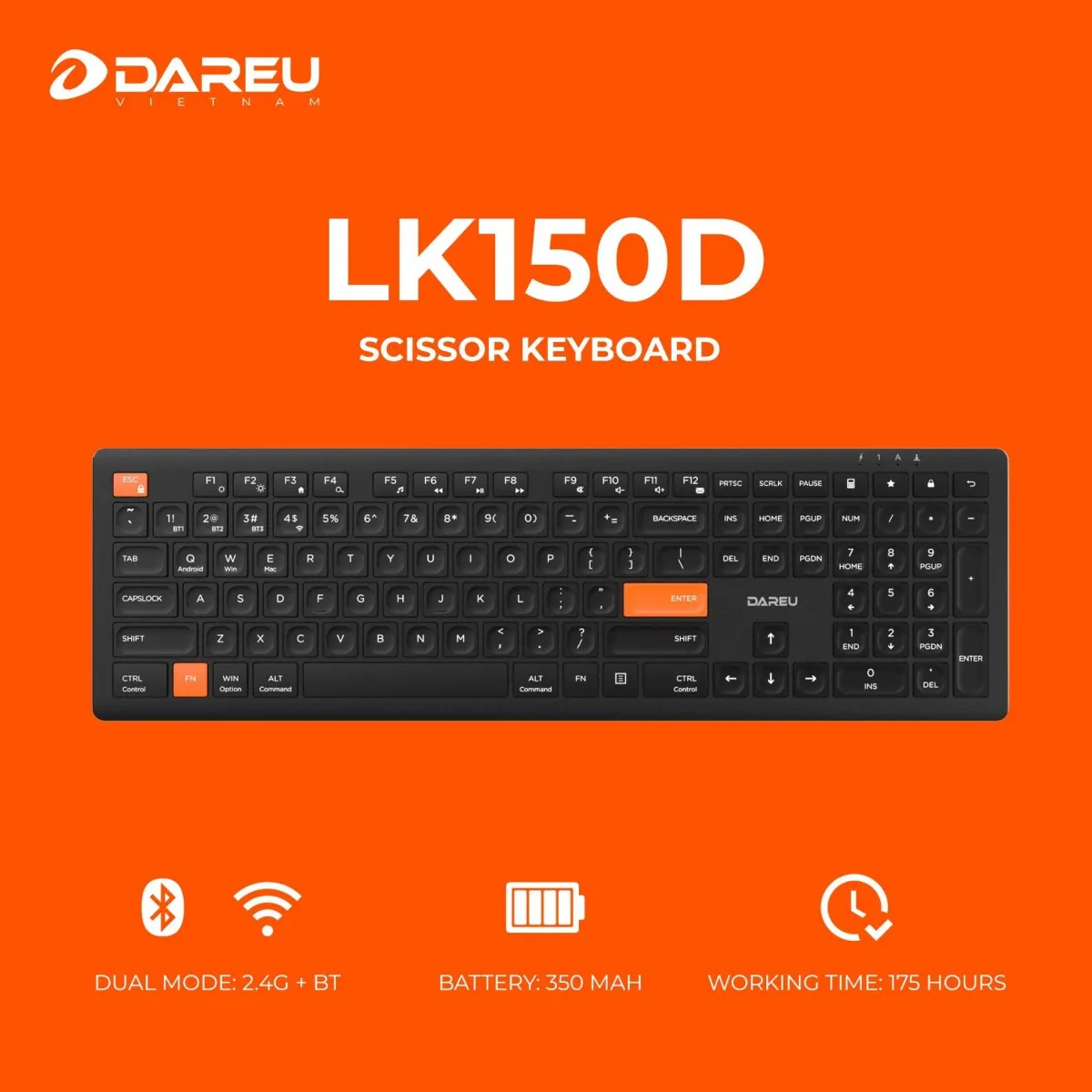 Bàn phím không dây DareU LK150D Black-Orange khơi nguồn cảm hứng gõ phím, tự do thao tác, khẳng định chất riêng. Được xây dựng với sự chú trọng đến từng chi tiết, sản phẩm bàn phím DareU này mang đến độ hoàn thiện cao cấp phục vụ tốt cho cả công việc văn phòng và học tập.