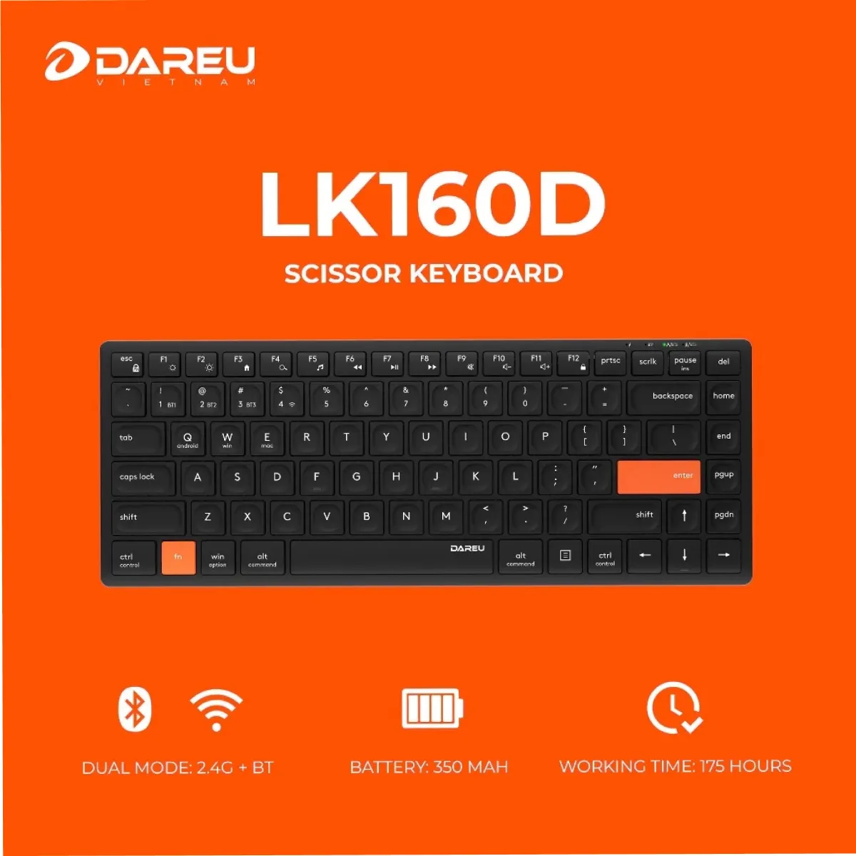 Giảm 500K khi thanh toán bằng thẻ tín dụng HDBankBàn phím không dây Dareu LK160D Black Orange là lựa chọn đáng chú ý trong phân khúc bàn phím văn phòng và giải trí với cân bằng giữa tính năng và thiết kế. Sản phẩm hỗ trợ kết nối kép tiện lợi thông qua sóng 2.4Ghz và Bluetooth, đồng thời sử dụng cấu trúc Scissor Switch đặc trưng. Dareu LK160D có layout TKL 86 phím nhỏ gọn và có thể hoạt động lên đến 175 giờ.