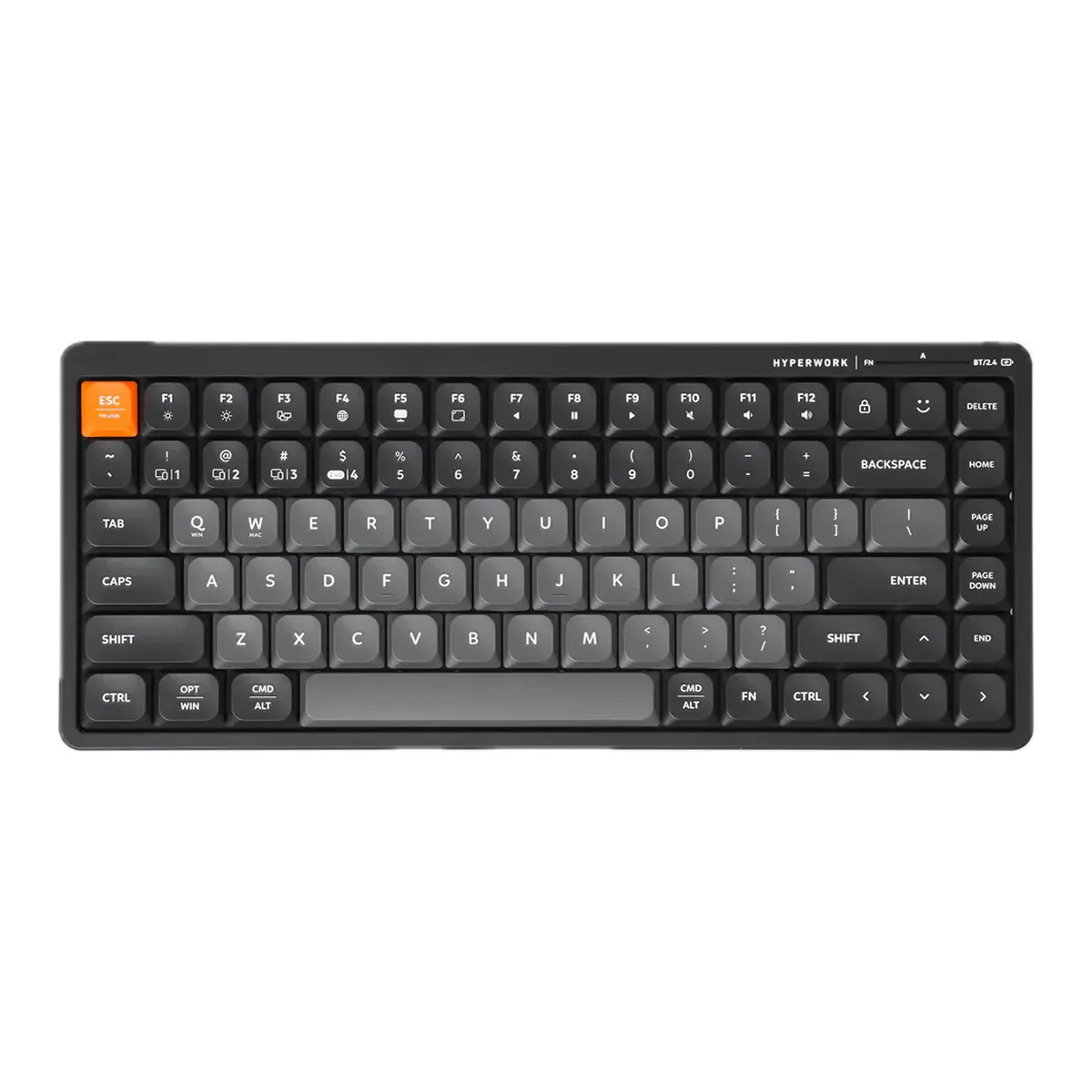 Bàn phím không dây Hyperwork SilentKey mini TS01M gây ấn tượng đầu tiên với ngoại hình hiện đại với 2 màu đen và xám làm chủ đạo. Các phím bấm được làm từ chất liệu nhựa ABS với lớp phủ chống phai và mờ chữ, giữ được độ bền và tính thẩm mỹ lâu dài. Bên cạnh đó, bàn phím  cũng sử dụng switch dạng X-Scissors, giúp giảm tiếng ồn khi gõ phím, mang đến trải nghiệm gõ nhẹ nhàng và êm ái.