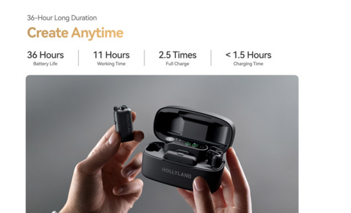 Nhờ viên pin dung lượng cao, bộ microphone thu âm Hollyland Lark Max 2 camera USB-C RX cung cấp khả năng hoạt động liền mạch mà không lo gián đoạn. Khi kết hợp cùng hộp sạc đi kèm, tổng thời gian sử dụng của hệ thống micro có thể kéo dài tới 36 giờ để phục vụ các buổi quay.