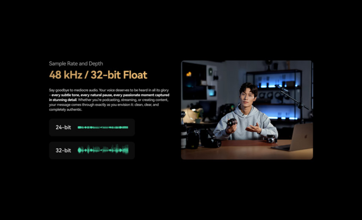 Bộ microphone thu âm Hollyland Lark Max 2 Ultimate Camera USB-C RX OWS Earphone sở hữu khả năng xử lý âm thanh 32-bit Float chuyên nghiệp. Công nghệ này giúp thiết bị ghi lại trọn vẹn dải động rộng mà không lo xảy ra tình trạng méo tiếng ở cường độ cao.