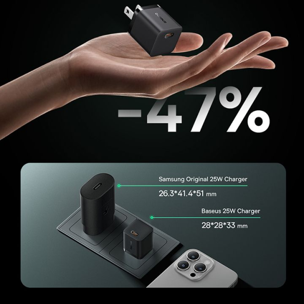 Bộ sạc Baseus GaN5 Mini 25W kèm cáp type C to C 100W 1M ứng dụng công nghệ chất bán dẫn Gallium Nitride (GaN5). Ngoài ra, sản phẩm có kích thước cực kỳ gọn (28×28×33mm), trọng lượng nhẹ chỉ khoảng 38.4g, nhỏ hơn tới 47% so với củ sạc Samsung S22 gốc.