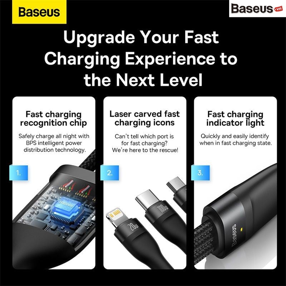 Cáp Baseus 3 in 1 USB-C to M+L+C 100W 1.5m mang đến hiệu năng vượt trội với đầu Type-C 100W, đầu Lightning 20W và đầu Micro 18W.