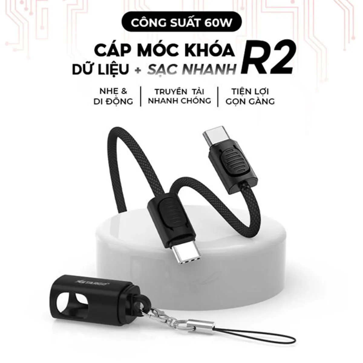 Stargo R2 được sản xuất theo hướng tối ưu tính cơ động, nổi bật với kiểu dáng móc khóa clip-on tiện lợi. Nhờ chi tiết này, người dùng có thể dễ dàng gắn cáp vào balo, túi xách, chìa khóa hoặc pin dự phòng để mang theo bên mình mà không lo thất lạc.