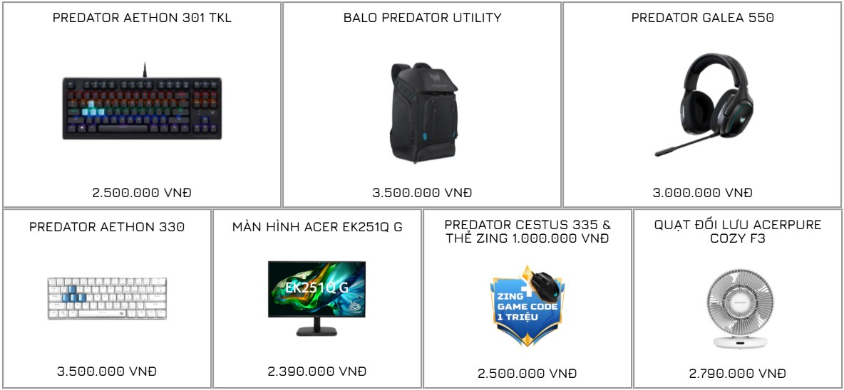 - Bàn phím Gaming Predator Aethon 301 TKL trị giá 2.500.000 VNĐ: Trải nghiệm cảm giác gõ siêu nhạy và thiết kế tối ưu cho game thủ.