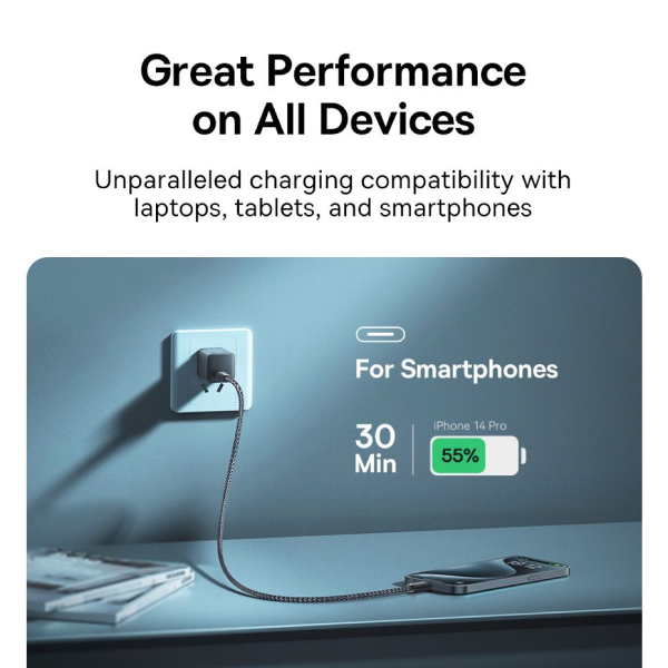 Củ sạc Baseus GaN5S 1C 20W US mang đến tốc độ sạc cao vượt trội qua công nghệ sạc nhanh PD và Quick Charger. Người dùng thoải mái nạp đầy năng lượng các thiết bị điện tử chỉ trong thời gian ngắn. Đi cùng công suất sạc lên đến 20W, Baseus GaN5S 1C cho phép sạc các thiết bị với hiệu suất cao, đồng thời không lo bị gián đoạn trong suốt quá trình sạc. Ngoài ra, phụ kiện này có khả năng tương thích rộng với iPhone cùng các dòng điện thoại, máy tính bảng, tai nghe không dây phù hợp khác.