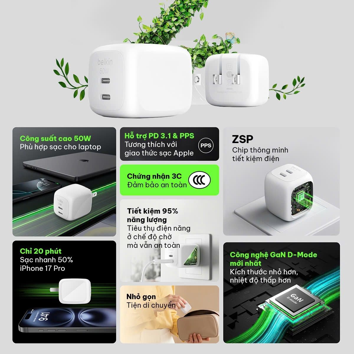 Sạc nhanh Belkin 50W 2 cổng USB-C PD/PPS Cubic Wall Charger - Cũ