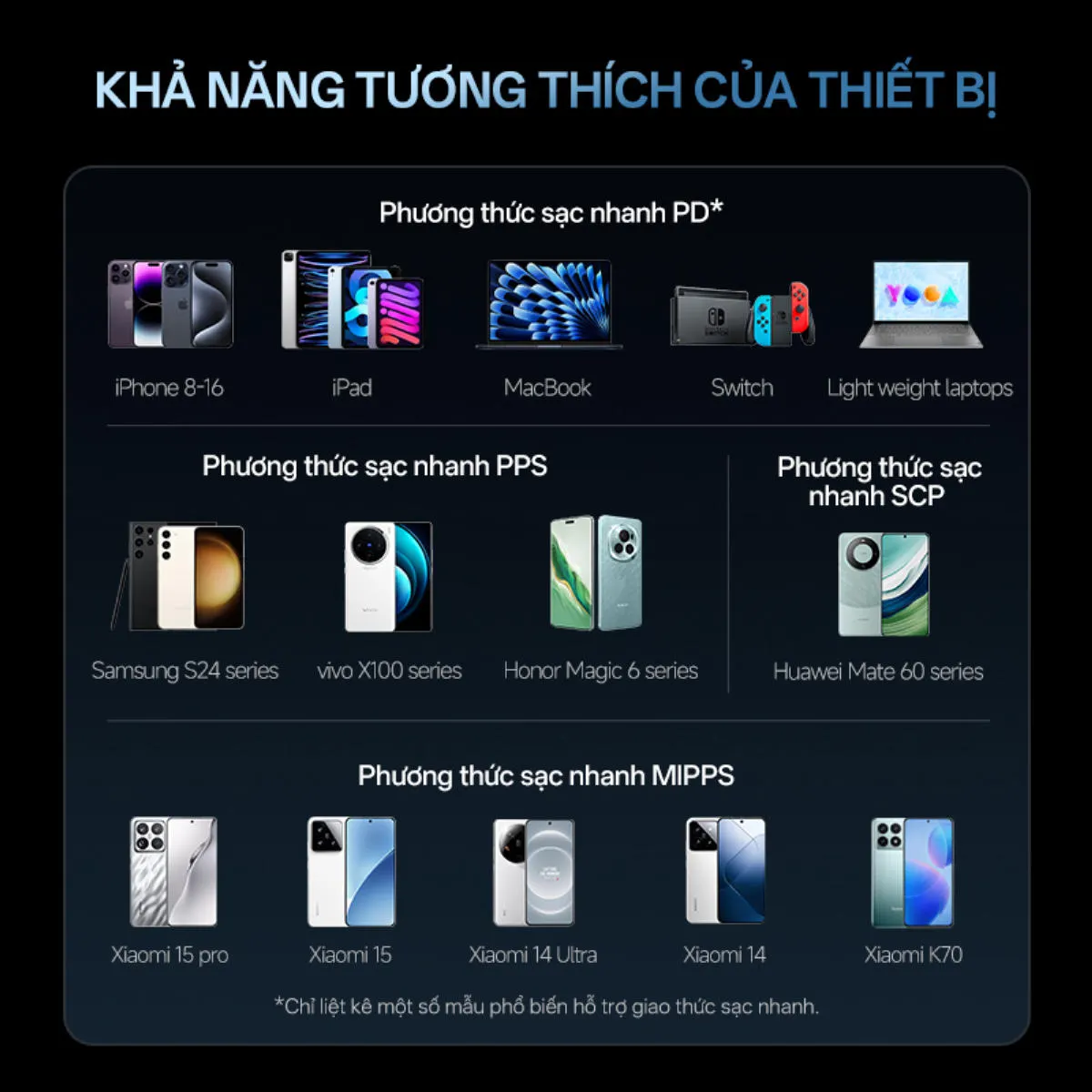 | Công nghệ/Đạt chứng nhận | PD 3.0, PPS 2.0, QC 4.0+, Mitubor 65W |