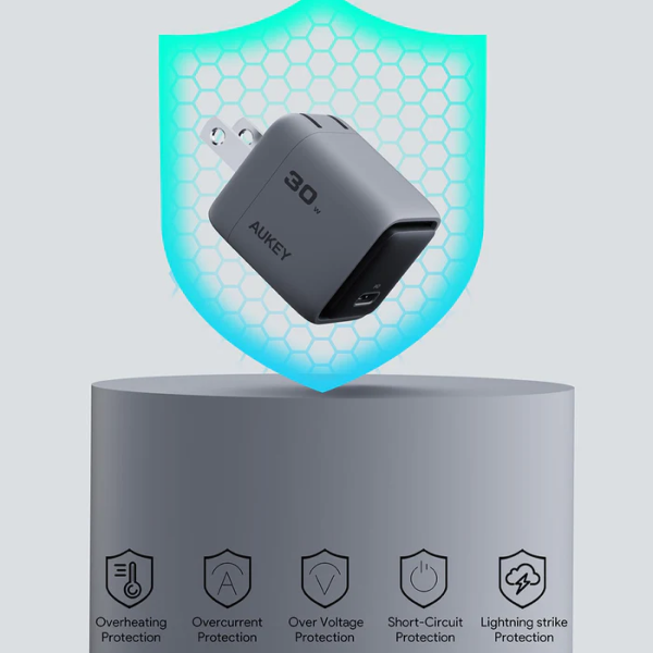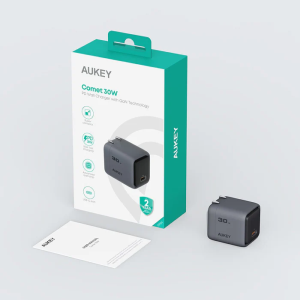 Củ sạc nhanh Aukey PD 30W PA C1 sử dụng mức công suất 30W, tích hợp con chip GaN thế hệ 3 giúp nạp pin nhanh chóng mà vẫn tiết kiệm điện, an toàn. Mẫu sạc nhanh này có kiểu dáng nhỏ gọn nhờ áp dụng công nghệ xếp chồng 3D tân tiến. Sản phẩm hoạt động tốt trên nhiều thiết bị Android, Apple và các thiết bị sử dụng cổng USB-C.