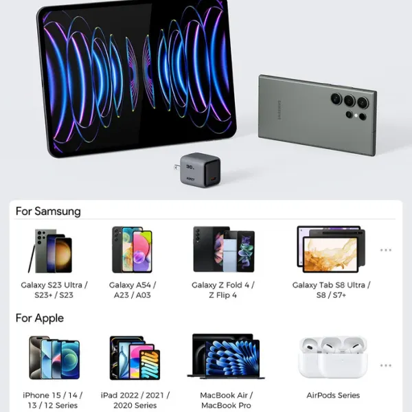 Củ sạc nhanh Aukey PD 30W PA C1 sở hữu công suất 30W, phù hợp nạp pin cho nhiều thiết bị di động như laptop mỏng nhẹ, smartphone, máy tính bảng. Cổng USB-C hỗ trợ chuẩn PD3.0 cùng các giao thức phổ biến như QC4+, PPS, AFC, FCP, SCP,... giúp thiết bị được nạp năng lượng hiệu quả và an toàn trong quá trình sử dụng.