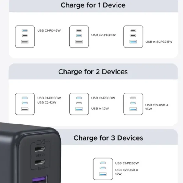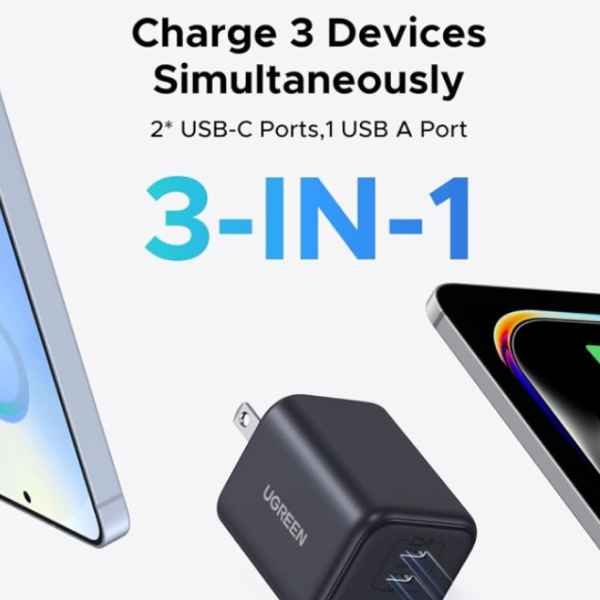 Ugreen đã trang bị cho củ sạc nhanh của hãng 2 cổng USB-C và 1 cổng USB-A. Nhờ vậy, sản phẩm có khả năng hỗ trợ sạc cho đa thiết bị cùng lúc để đáp ứng tốt hơn nhu cầu của người dùng trong cuộc sống bận rộn.