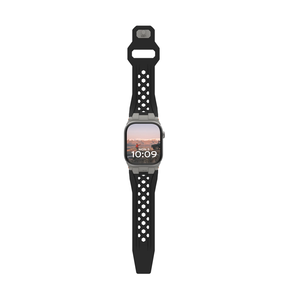 Dây đeo Apple Watch UAG Monarch 44/45/46/49mm được chế tác từ FKM Fluoroelastomer cao cấp với phần cứng thép không gỉ màu titan và thiết kế đục lỗ. Trọng lượng 0,13 pound cùng chiều dài 10,5 inch mang lại cảm giác đeo thoải mái. Hệ thống khóa Tuck-and-Pin giữ dây gọn gàng, giảm sự vướng víu khi di chuyển.