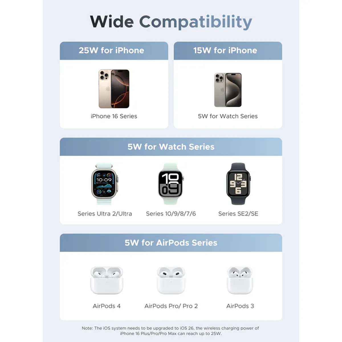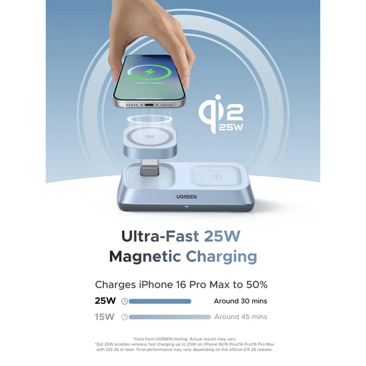 Đế sạc không dây để bàn Ugreen Magflow 3 trong 1 25W có tổng công suất đầu ra lên tới 35W. Cụ thể, đế sạc iPhone có công suất 25W tương thích với các dòng iPhone 12 trở lên, đế sạc AirPods và Watch giới hạn ở mức 5W. Với công suất sạc cao, người dùng hoàn toàn có thể sạc 3 thiết bị cùng lúc mà không gặp bất kỳ trở ngại nào.