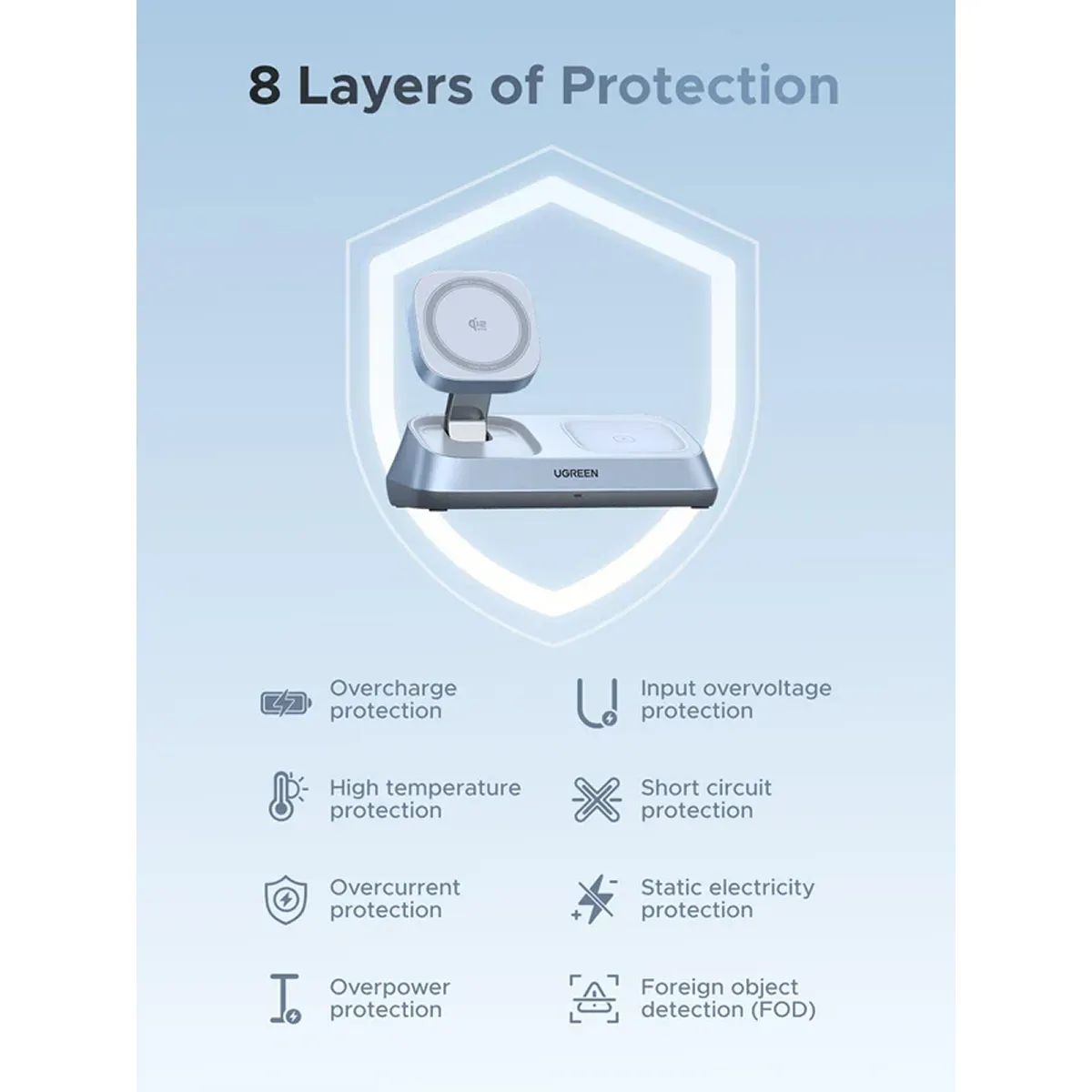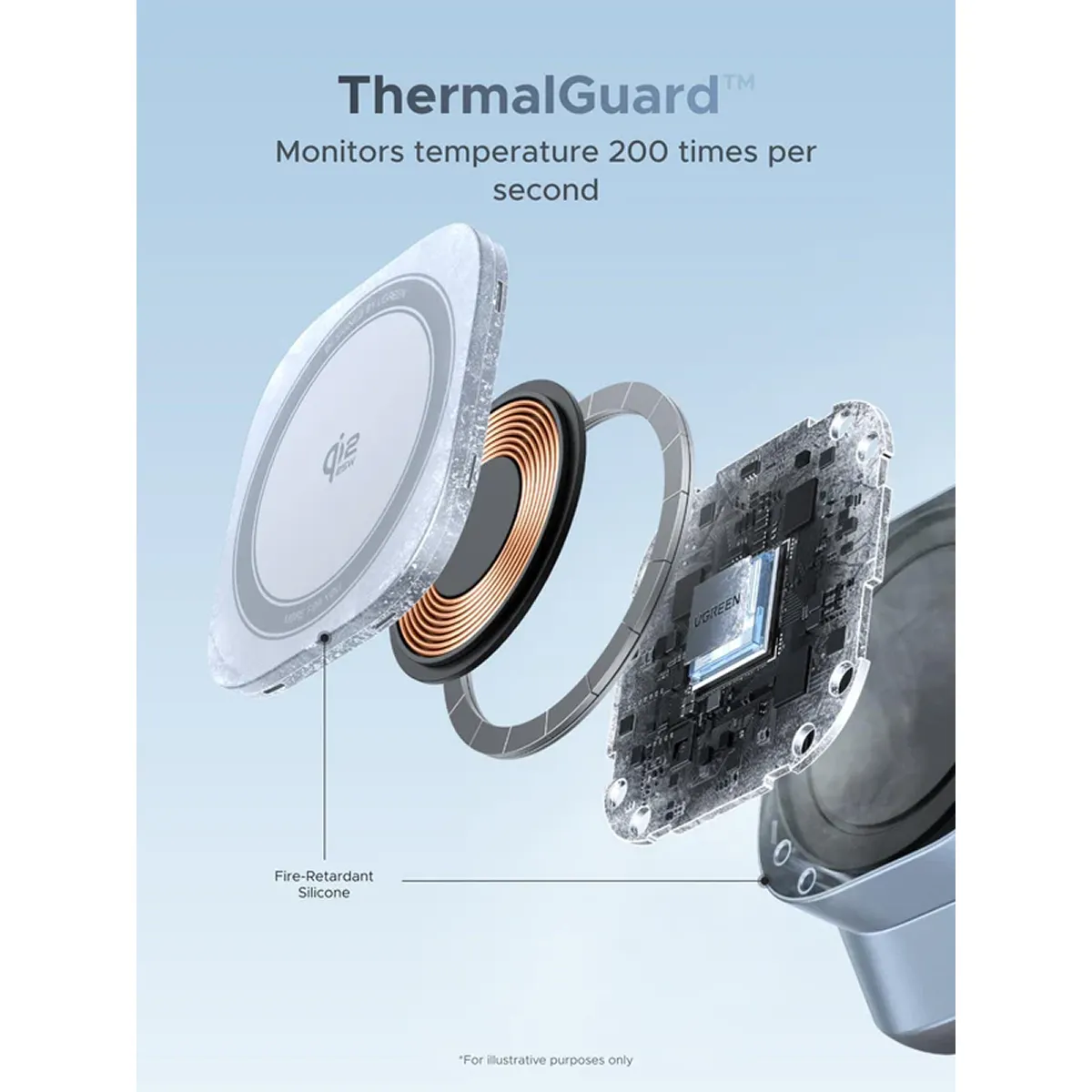 Đế sạc không dây Ugreen Magflow được trang bị hệ thống ThermalGuard, giúp theo dõi nhiệt độ theo thời gian thực trong quá trình sạc. Theo Ugreen, công nghệ này giúp sản phẩm luôn duy trì mức nhiệt dưới 58°C.