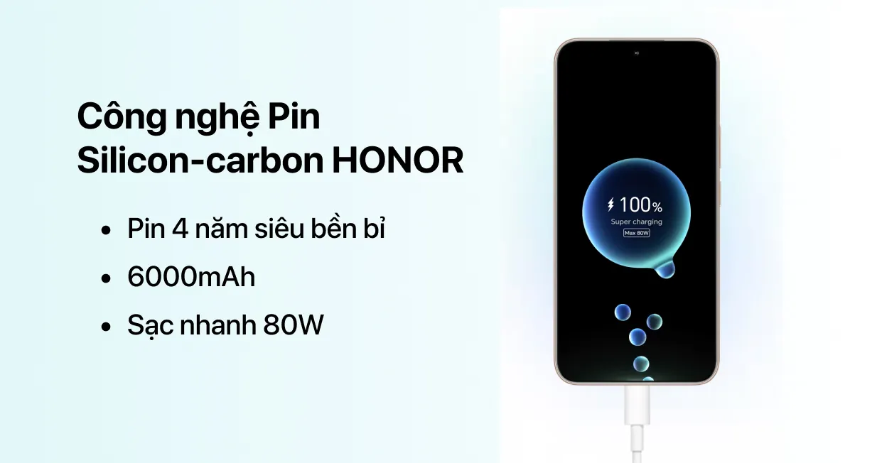 Hơn thế nữa, điện thoại còn hỗ trợ công nghệ sạc siêu nhanh HONOR 80W SuperCharge. Với công suất này, máy có được dung lượng đủ dùng trong nhiều giờ, tiết kiệm đáng kể thời gian chờ đợi. Công nghệ sạc nhanh còn được tối ưu để giảm tình trạng nóng máy, bảo vệ tuổi thọ pin lâu dài.