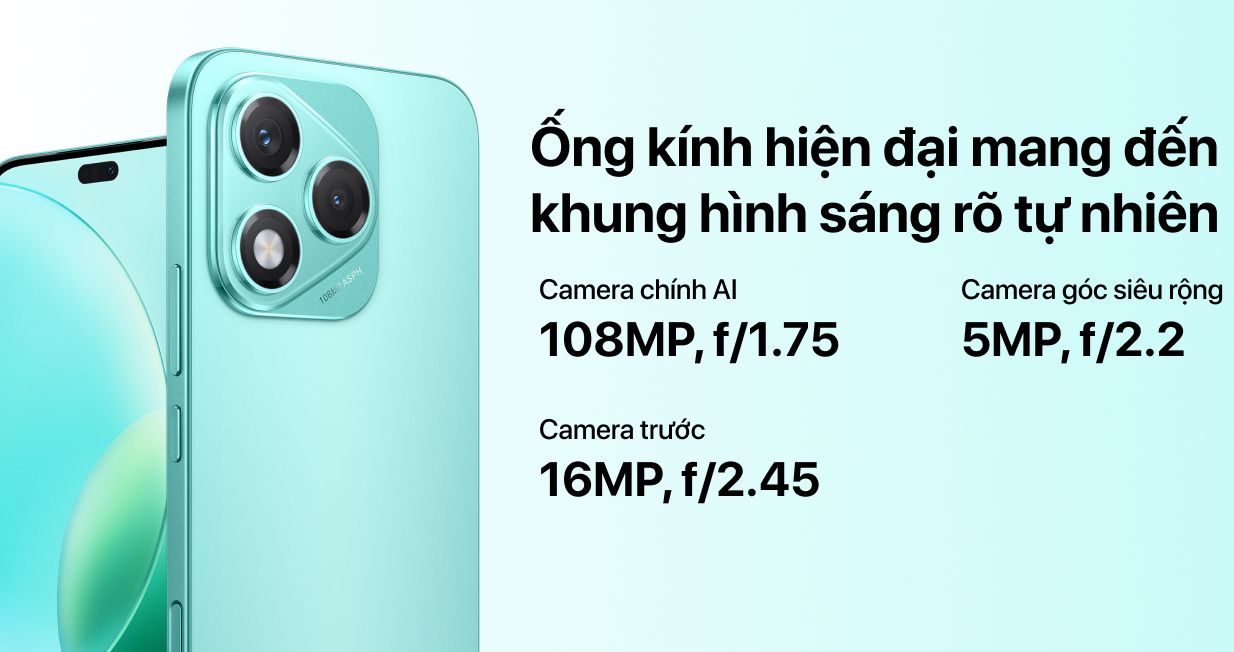 Điện thoại HONOR 400 Lite 5G sở hữu camera chính 108MP khẩu độ f/1.75 cùng cảm biến lớn 1/1.67 inch, mang lại hình ảnh chi tiết và sắc nét. Camera góc rộng & chiều sâu 5MP cùng camera trước 16MP hỗ trợ chụp ảnh đa dạng, từ phong cảnh đến selfie. Hệ thống đèn flash selfie tích hợp giúp gương mặt luôn sáng rạng rỡ trong mọi bối cảnh.