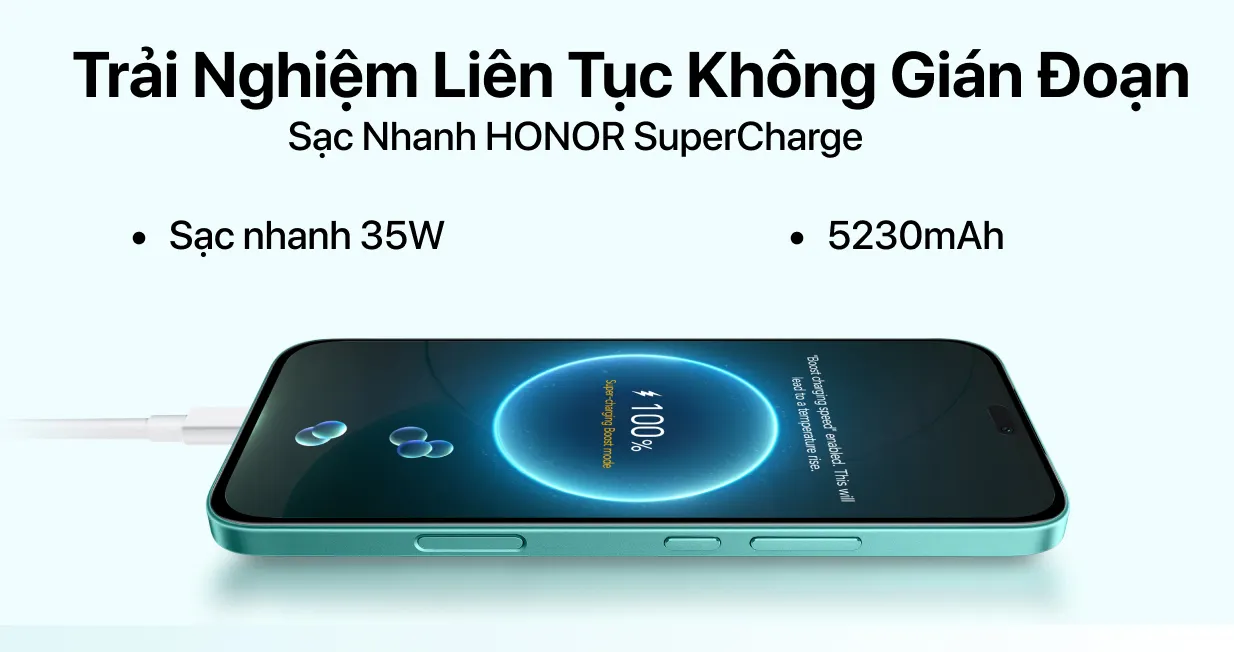 Bên cạnh đó, máy hỗ trợ công nghệ sạc nhanh HONOR SuperCharge 35W, giúp nạp lại năng lượng chỉ trong thời gian ngắn. Người dùng có thể nhanh chóng quay lại công việc hay giải trí mà không lo gián đoạn.