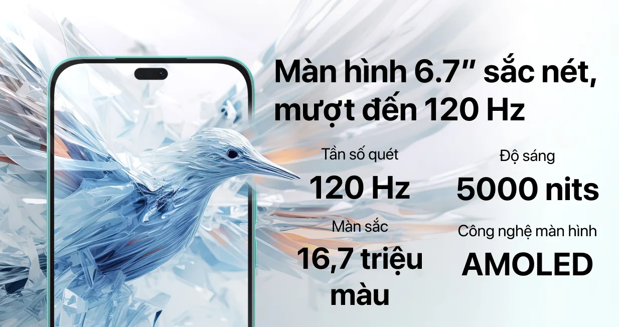 Điện thoại HONOR 400 Lite 5G được trang bị màn hình AMOLED 6.7 inch với độ phân giải 2412 x 1080 pixels, mang lại hình ảnh sắc nét và màu sắc sống động. Độ sáng tối đa 3500 nit cùng tần số quét 120Hz giúp hiển thị mượt mà và rõ ràng ngay cả dưới ánh nắng gắt.