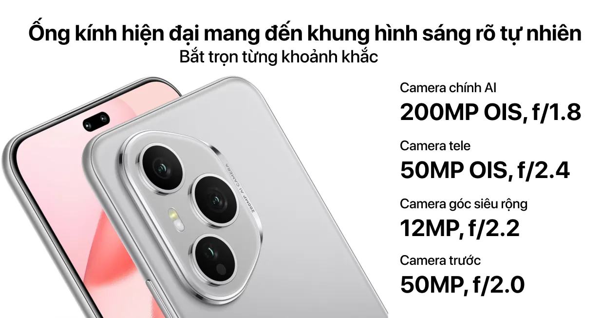 | Camera sau | 200MP (f/1.9, OIS) + 50MP Tele (f/2.4, OIS) + 12MP Góc siêu rộng (f/2.2), zoom số 50x |