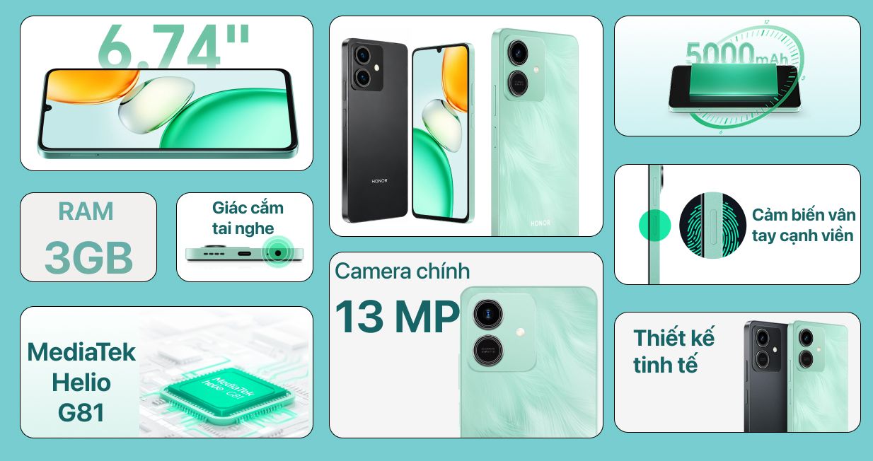 Máy có hai lựa chọn màu sắc là đen lịch lãm, xanh lá trẻ trung, phù hợp với mọi cá tính. Đáng chú ý, smartphone Honor này vẫn giữ lại cổng tai nghe 3.5 mm truyền thống, giúp tối ưu trải nghiệm mà không cần phụ kiện chuyển đổi rườm rà.
