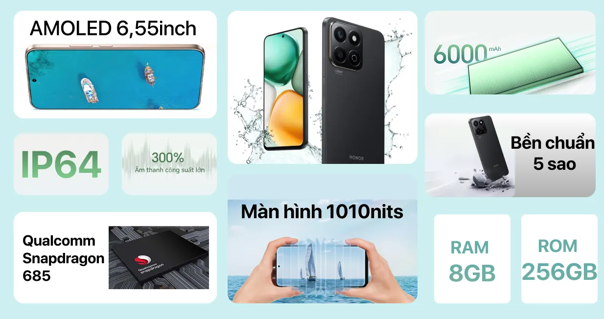 Điện thoại Honor X7C trang bị màn hình 6.77 inch tần số quét 120 Hz cho hiển thị mượt mà, giúp người dùng thoải mái giải trí và làm việc hiệu quả. Máy sở hữu bộ vi xử lý Snapdragon 685 kết hợp RAM 8GB, mang đến khả năng xử lý đa nhiệm ổn định trong nhiều tình huống. Ngoài ra, máy còn ghi điểm với pin 6000mAh đi kèm sạc nhanh 35W hỗ trợ sử dụng lâu dài.