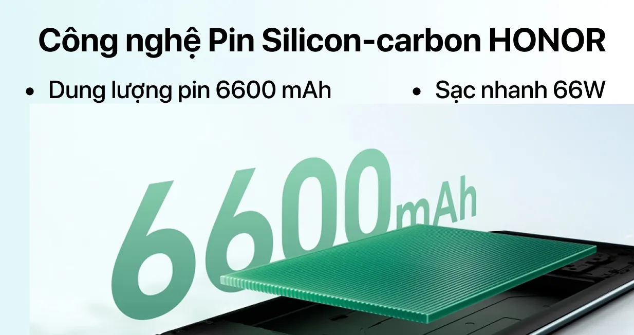 Một trong những điểm nhấn quan trọng của điện thoại Honor X9C 5G là viên pin silicon-carbon 6600mAh. Pin có thể phát nhạc liên tục hơn 48 giờ, xem video gần 26 giờ và duy trì cuộc gọi thêm 50 phút dù chỉ còn 2% nhờ AI Super Power Saving Mode.