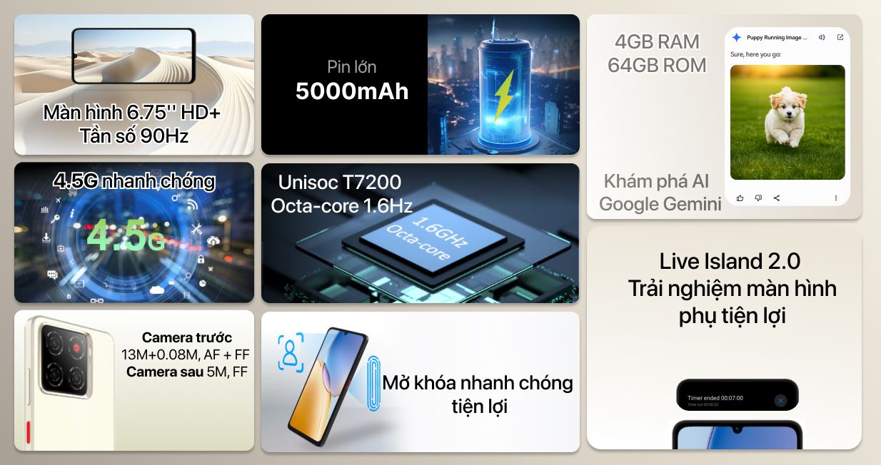 nubia A56 được trang bị vi xử lý 8 nhân T7200 với tốc độ 1.6GHz, mang lại hiệu năng ổn định cho các tác vụ thông thường như lướt web, học trực tuyến và xử lý ứng dụng. GPU ARM Mali G57 tích hợp hỗ trợ xử lý đồ họa cơ bản, phù hợp với nhu cầu giải trí nhẹ.