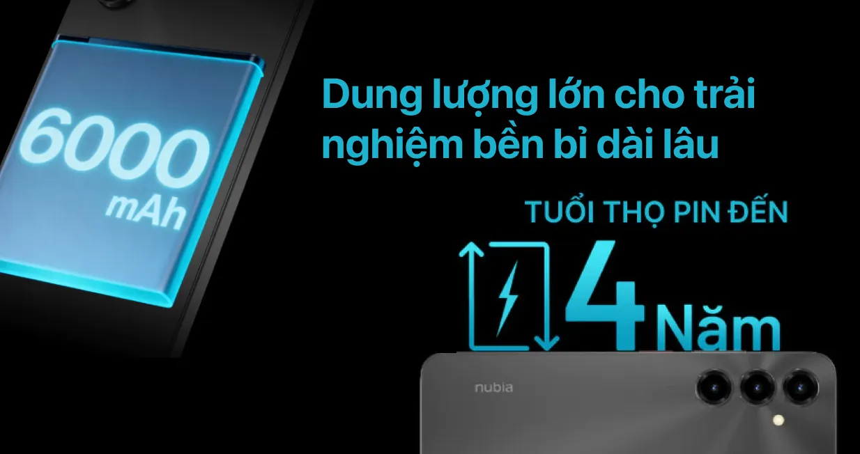 Điện thoại nubia V80 Max sở hữu viên pin dung lượng lớn 6000mAh, mang lại thời gian sử dụng dài vượt trội. Với dung lượng này, người dùng có thể yên tâm sử dụng điện thoại suốt cả ngày dài cho nhiều tác vụ liên tục. Dựa theo tần suất và tác vụ xử lý mà thiết bị sẽ cung cấp thời lượng khác nhau.