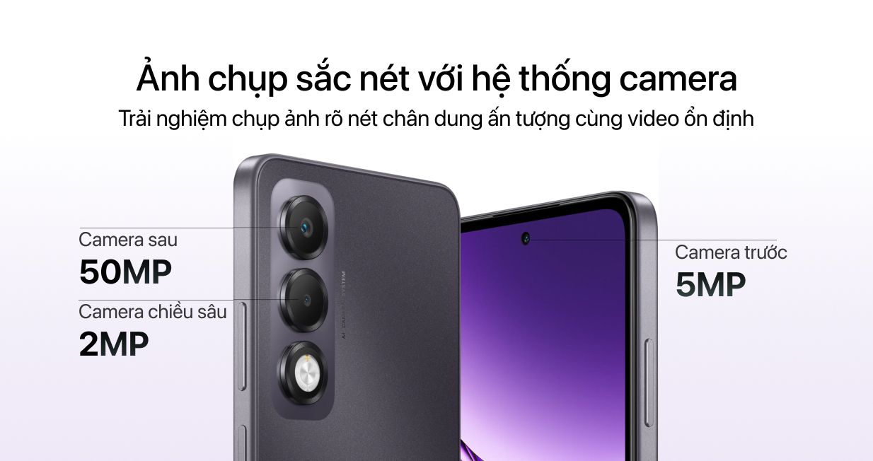 Điện thoại OPPO A5i Pro được trang bị hệ thống camera kép ở mặt sau, bao gồm camera chính 50MP và camera phụ 2MP mono. Cụm camera này giúp tái tạo hình ảnh sắc nét, màu sắc hài hòa và hỗ trợ chụp chân dung xóa phông tự nhiên, mang lại chiều sâu cho bức ảnh.