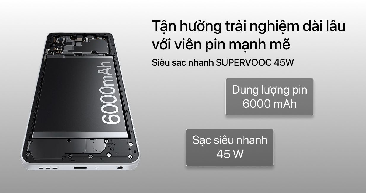 Thiết bị hỗ trợ sạc nhanh SuperVOOC 45W, giúp rút ngắn đáng kể thời gian sạc. Đây là điểm cộng lớn cho người dùng thường xuyên di chuyển hoặc cần sạc pin nhanh chóng trong ngày.