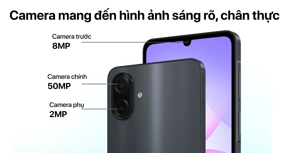 Điện thoại Samsung Galaxy A07 4GB 128GB được trang bị hệ thống camera kép ở mặt sau, gồm cảm biến chính 50MP và cảm biến độ sâu 2MP. Ống kính chính của sản phẩm giúp thu sáng tốt hơn khi chụp trong điều kiện thiếu sáng.