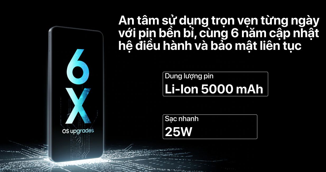 Thiết bị được hỗ trợ 6 lần nâng cấp hệ điều hành giúp luôn bắt kịp tính năng mới, cùng 6 năm cập nhật bảo mật để bảo vệ dữ liệu và quyền riêng tư, duy trì hiệu suất ổn định theo thời gian (lưu ý số lần nâng cấp có thể thay đổi tùy thuộc vào chính sách của hãng).