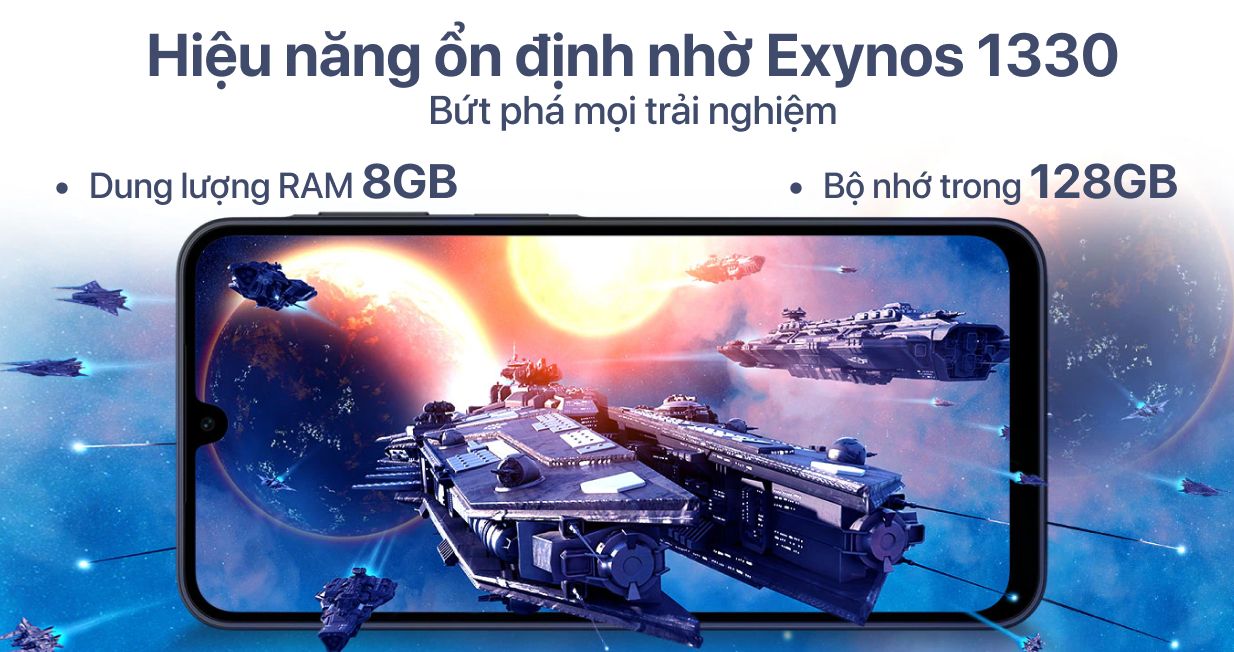 Vi xử lý Exynos 1330 hỗ trợ chạy mượt các tác vụ từ giải trí đến công việc văn phòng, tối ưu khả năng đa nhiệm. Nhờ vào con chip hiện đại này, người dùng có thể chuyển đổi nhanh chóng giữa các tác vụ mà không gặp tình trạng giật lag.