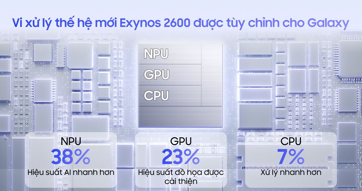 Về mặt sức mạnh, smartphone Samsung Galaxy S26 12GB 512GB tương tự như S26 Plus được trang bị vi xử lý Exynos 2600 tiến trình 2nm. Con chip này đảm bảo cung cấp hiệu năng ấn tượng để vận hành mượt mà nhiều tựa game nặng cũng như các tác vụ AI thế hệ mới.