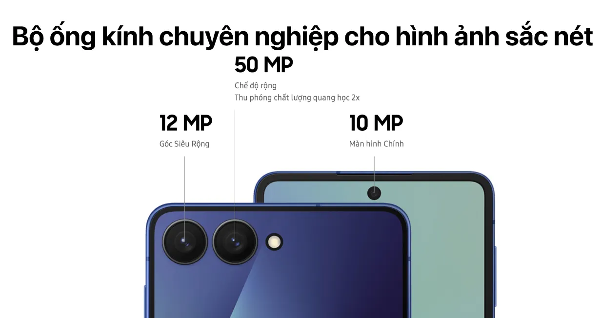 Điện thoại Samsung Galaxy Z Flip 7 12GB 512GB tiếp tục được trang bị cụm camera kép 50MP và 12MP. Cụm camera sau của điện thoại còn được tích hợp các công nghệ OIS, PDAF để có được khả năng quay, chụp ấn tượng.